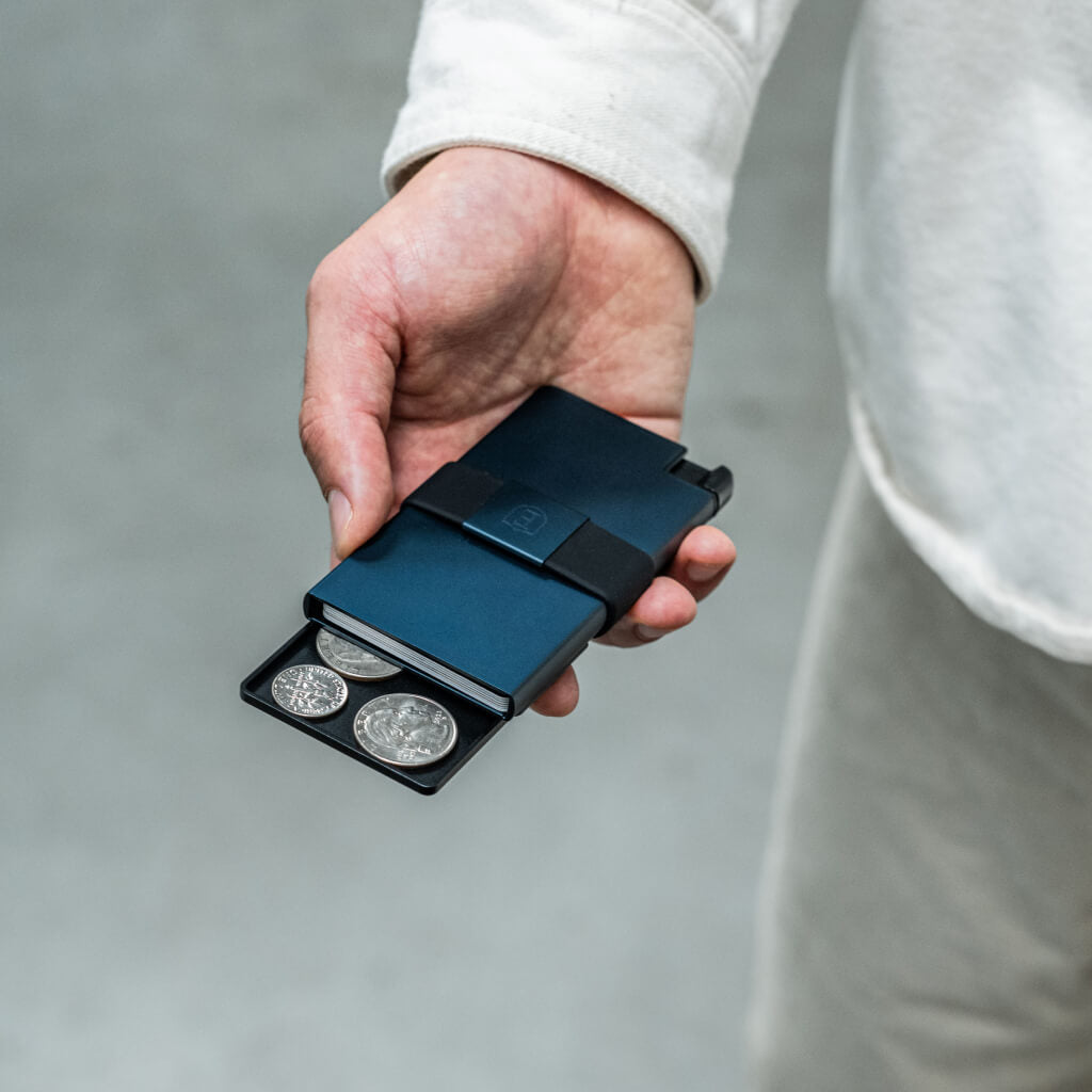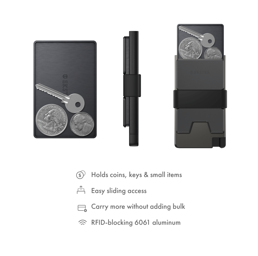 Want to carry coins without adding bulk to your wallet? The slim Coin Tray add-on fits onto the back of any Ekster cardholder between the main body and expandable backplate. Made from recycled 6061 aluminum and RFID-protected, it offers a streamlined and secure spot for loose change, keys, or other small items.