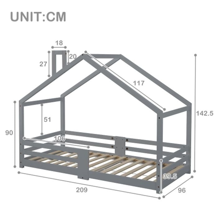 Lit cabane Maison 90 x 200cm Gris